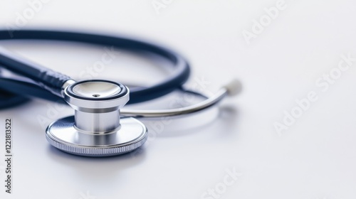 A high-resolution close-up of a medical stethoscope resting on a patient’s chest, against a white background, Minimalist style
