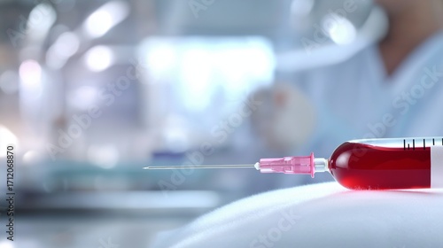 A high-resolution close-up of a medical syringe filled with a red fluid, with the needle facing forward