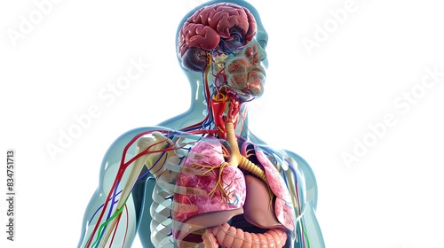 A high-resolution illustration of a human figure with transparent skin showing the major internal organs in vibrant colors. The heart, lungs, liver, and intestines are accurately positioned and