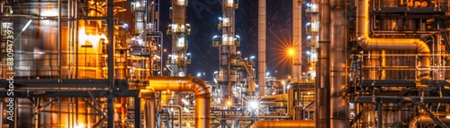 A high-resolution image of an oil refinery at night, with bright lights, tall stacks, and complex piping systems, with copy space.