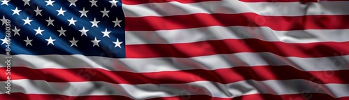 A high-resolution image of United States flag waving in the wind, showcasing vibrant red, white, and blue colors with stars and stripes. Wide banner of national flag.