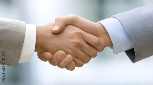 A high-resolution photo of a business handshake in a modern office, clean and professional