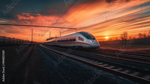 A high-speed train speeding along its tracks, captured at sunset with the sky painted in warm orange and pink hues, highlighting the beauty of travel.