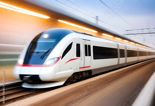 A high-speed train traveling at a fast speed on a railway track, with blurred motion in the background