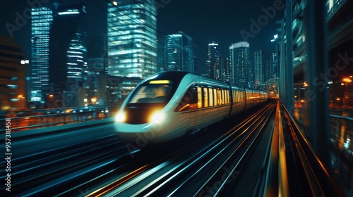 A high-speed train traveling at night, with city lights reflecting off its metallic surface and motion blur conveying the incredible speed at which it moves.