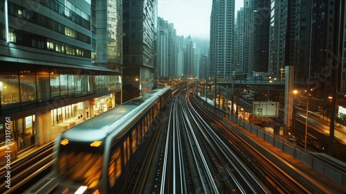 A high-speed train travels through a modern city on elevated tracks during the evening