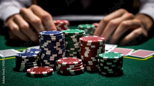 A high-stakes poker game in a luxurious casino, with players intensely focused and chips stacked high on the table