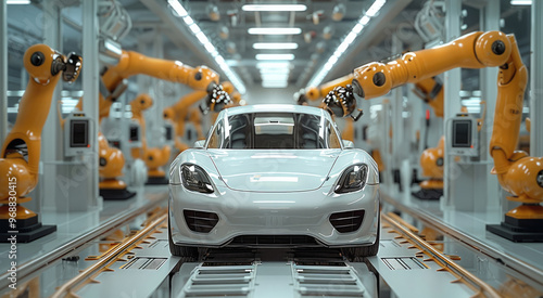 A high-tech car factory with robotic arms assembles cars, full of modern technology and a futuristic atmosphere. Generative AI.