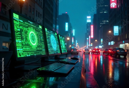 a hightech city scene with a focus on cybersecurity
