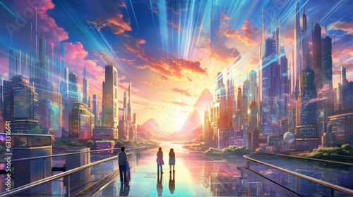 A hightech cityscape complete with holographic billboards towering buildings and flying cars all illuminated by a technicolor cyberpunk ar