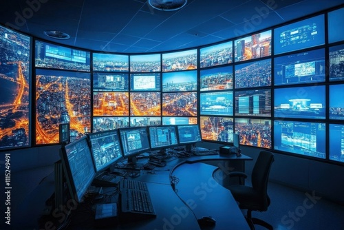 A high-tech control room with multiple screens displaying cityscapes.