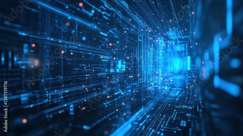 A high-tech digital blue background featuring floating holographic elements and glowing circuit patterns