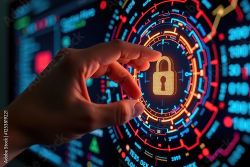 A high-tech digital padlock being unlocked by a fingerprint, set against a futuristic technology-themed background. The glowing biometric scanner highlights advanced security