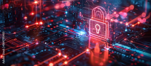 A high-tech digital security concept featuring a glowing lock icon on a futuristic circuit board background, symbolizing cybersecurity and data protection.