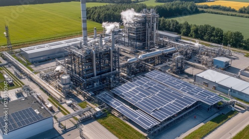 A high-tech factory using renewable energy with visible solar panel installations.