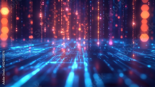 A high-tech grid of neon-lit lines and circuits, with glowing blue and orange dots floating