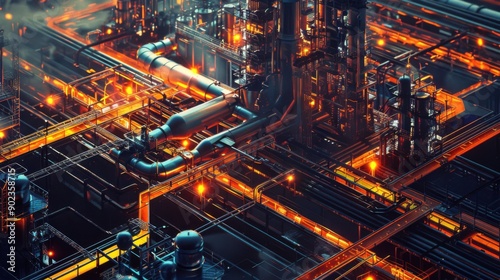A high-tech industrial facility with glowing lights, showcasing intricate pipe systems and machinery in a futuristic setting.