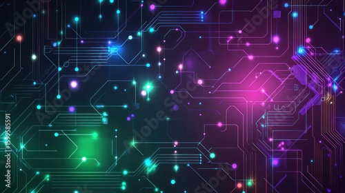 A high-tech inspired abstract design with glowing circuit lines, digital grids, and neon colors like green and purple, set against a dark, futuristic background