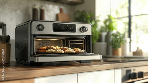 A high-tech toaster oven with an energy-efficient design and soft LED display, cooking a tray of cookies, with a modern kitchen backdrop.