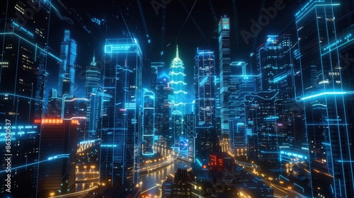 A high-tech urban skyline overlaid with blue holographic lights and data streams.