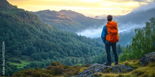 A hiker gazes at a scenic view of lush green mountains and valleys. The sunset casts a warm glow. Adventure awaits in the great outdoors. Perfect for travel inspo and nature lovers. AI