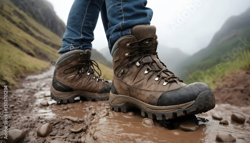 A Hiker Girl’s Muddy Boots Stepping on a Rocky Trail