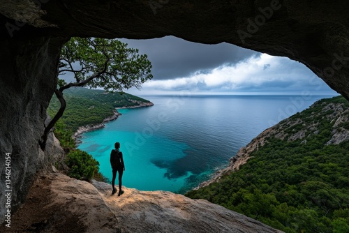 A hiker standing on a cliff in the Calanques National Park, admiring the breathtaking turquoise sea below