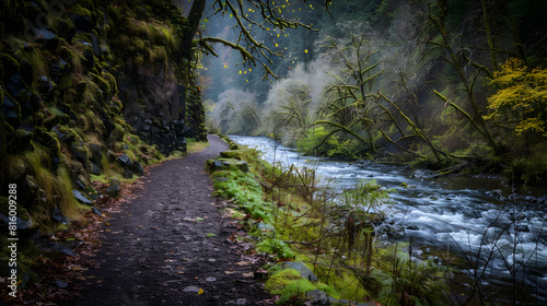 A hiking path along a river in a steep valley with high stone walls Oregon United States of America North America : Generative AI