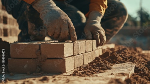 A Hispanic construction worker laying brick for a new wall at a construction site. Featuring masonry skills and precision