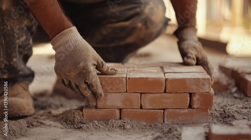 A Hispanic construction worker laying bricks for a foundation at a construction site. Featuring skill and precision