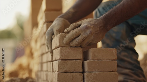 A Hispanic construction worker placing bricks for a wall at a construction site. Featuring technique and focus