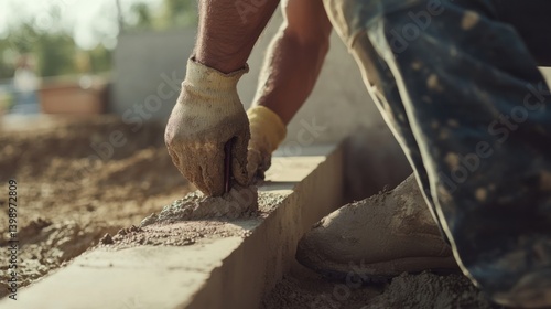 A Hispanic construction worker sealing a foundation at a construction site. Featuring focus and expertise