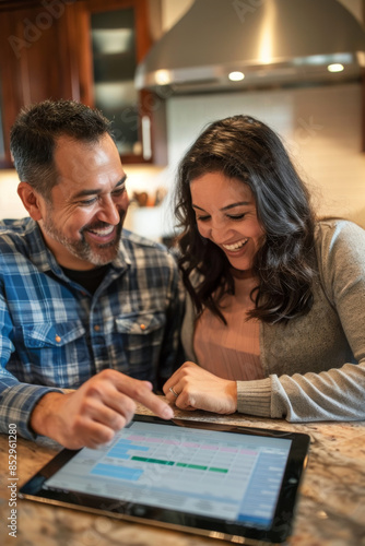 a Hispanic couple organizing their day together with a shared digital calendar on a tablet