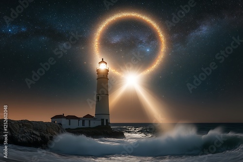 A historic lighthouse casting a bright beam of light across the ocean waves, surrounded by a glowing halo under a starry night sky.