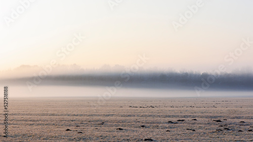 A hoarfrost covered misty meadow at sunrise in the Siebenbrunn nature reserve near Augsburg, Germany