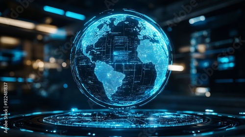 A holographic digital globe with illuminated continents, showcasing global data and connectivity in a futuristic, high-tech environment.