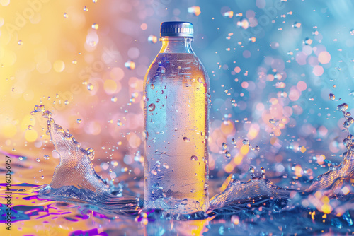 A holographic lemonade bottle amidst a splash of water. A refreshing summer drink. Lemonade on white background.