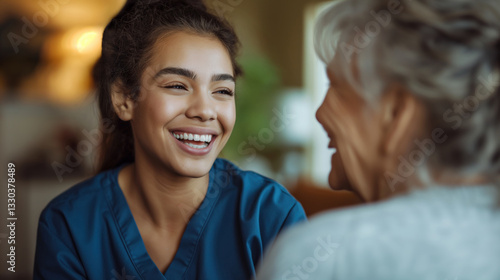 A home health care worker assists an elderly woman in her home / Healthcare aide / Medical assistant
