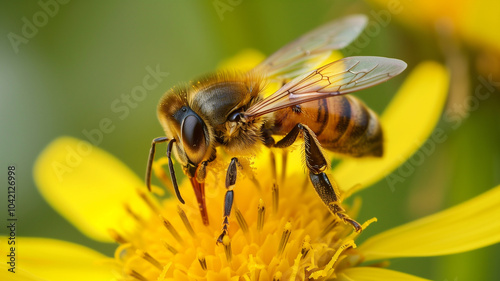 A honey bee on the yellow flower. Pollination or ecosystem concept