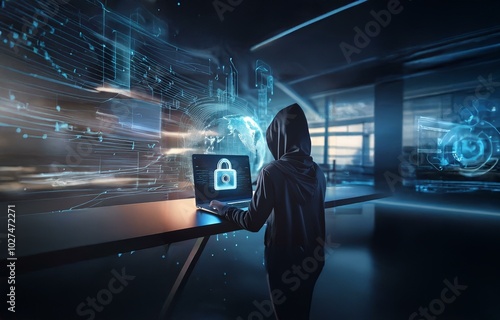 A hooded figure sits at a desk in front of a laptop, working on a cybersecurity project. The screen displays a glowing lock icon.
