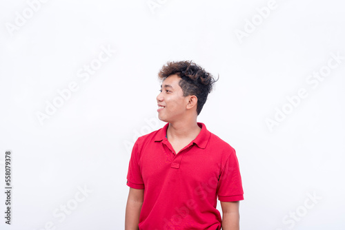 A hopeful young man looking at the left. Visualizing happiness. Isolated on a white background.