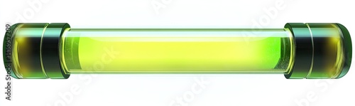 A horizontal, glass tube with green caps and glowing yellow liquid inside