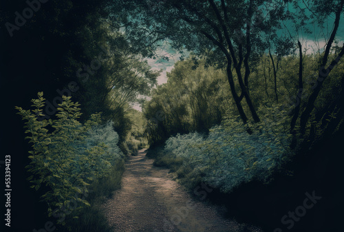 a horizontal view of a barren trail in a lush woodland. Generative AI