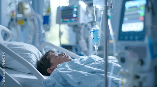 A hospital bed with a young patient resting peacefully after surgery.