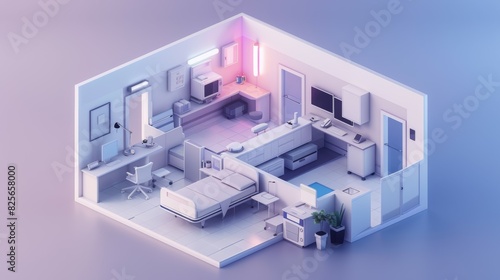A hospital room with a bed, desk, a chair, a television, and a potted plant, isometric style