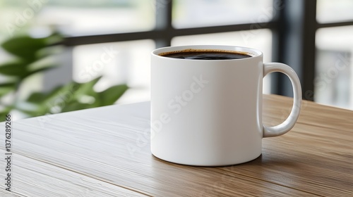 A hot cup of coffee on a wooden desk in a modern workspace