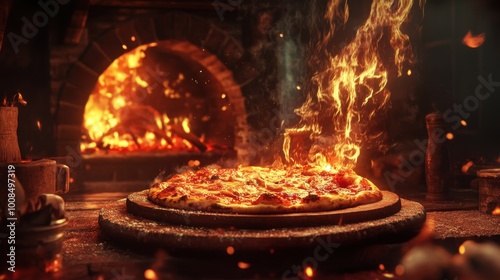 A hot, freshly baked pizza being pulled from a traditional brick oven, with fire and smoke swirling around. Realistic, very detailed.
