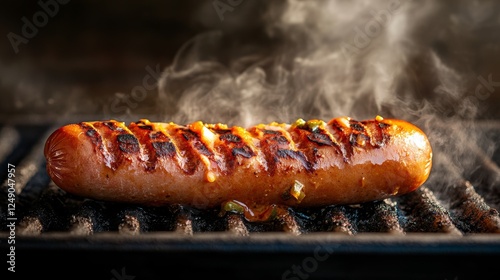A hotdog is being cooked on a barbecue grill with smoke ascending into the air