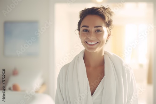 a hotel suite, as a young lady luxuriates in a soft bathrobe, emanating tranquility and relaxation amidst the lavish setting.
