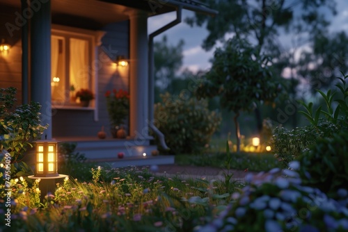 A house illuminated at night in a garden. Suitable for real estate or outdoor lighting concepts